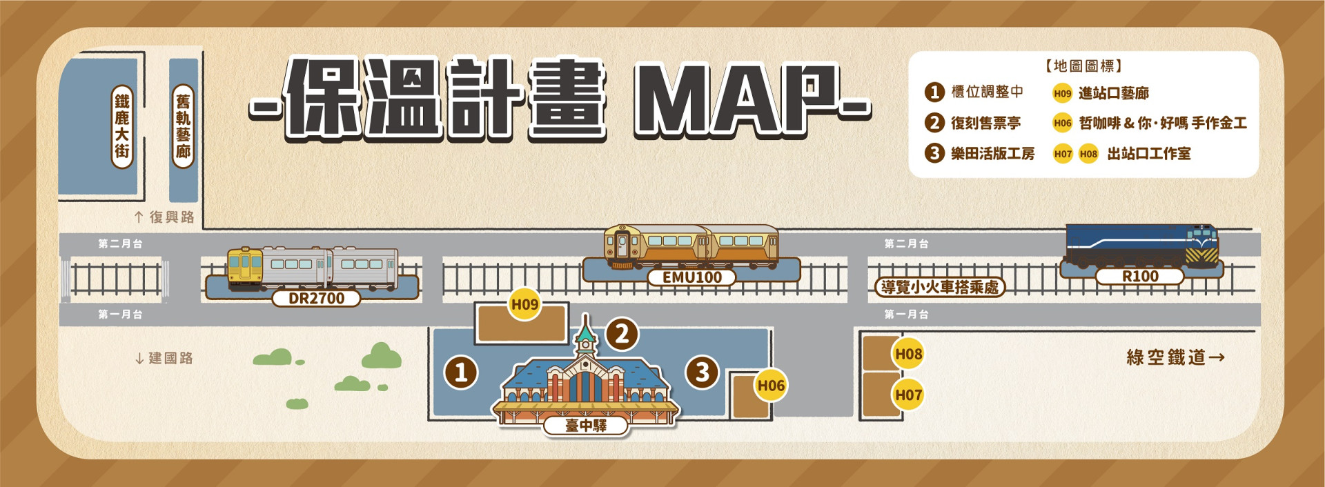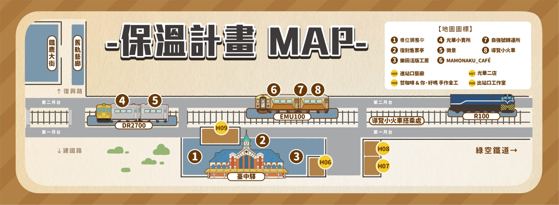 | 2. 復刻售票亭 | H06. 哲咖啡&你,好嗎 手作金工 | 5. 微景 | 7. 自強號運轉所 |