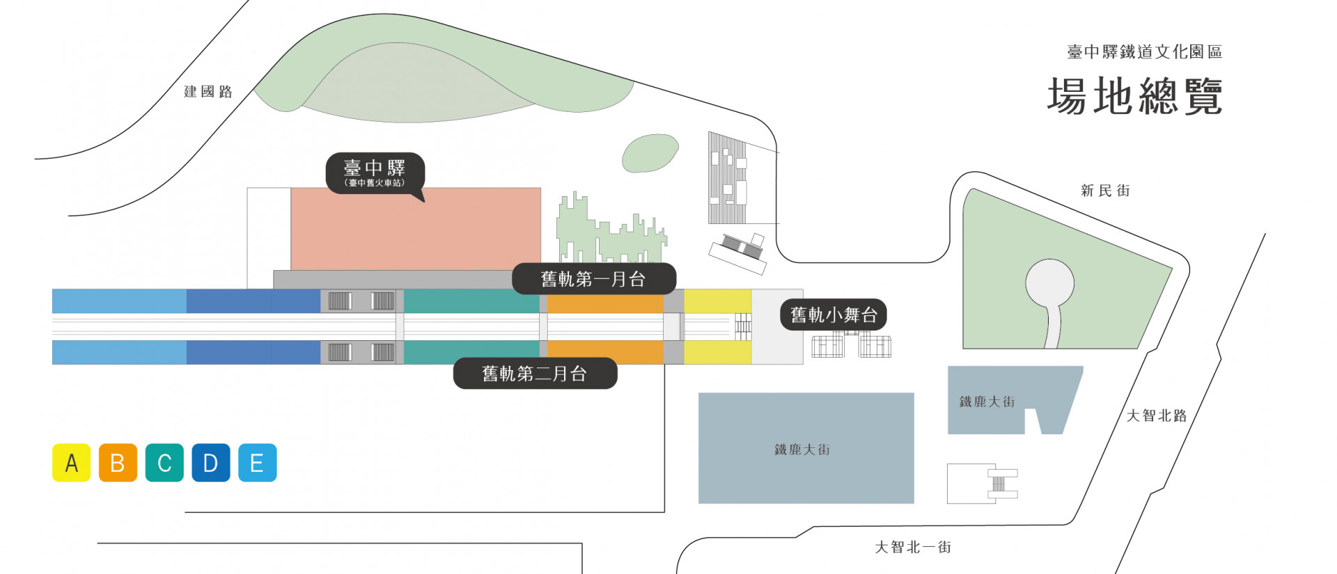 | 鐵鹿大街 | 保溫計畫 | 第一代停車場事務室 | 臺中驛 | 舊軌小舞台 | 舊軌第一、二月台 |